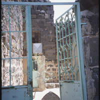 View through gate onto stone engraved in Arabic