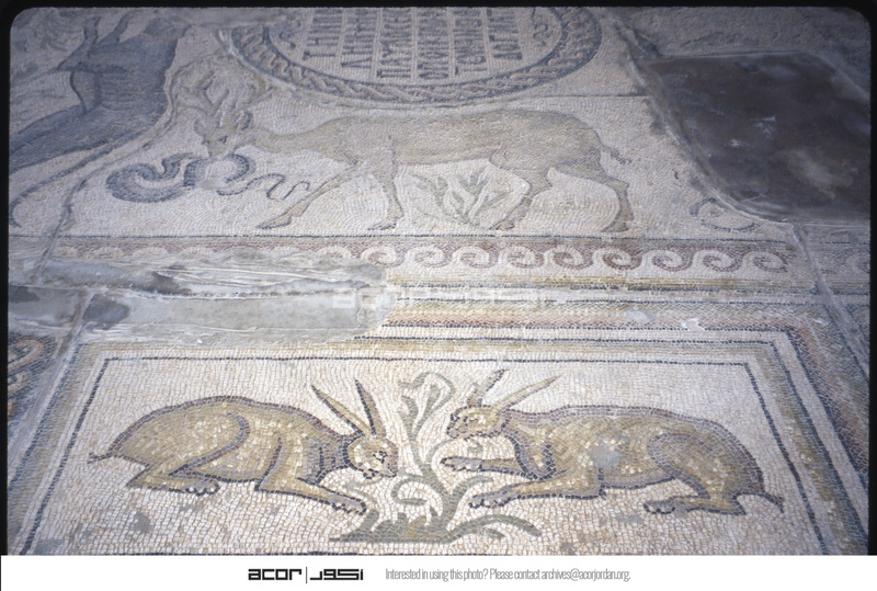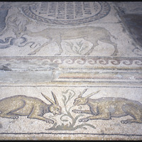 Detail from mosaics floors depicting rabbits eating grass and a deer