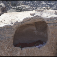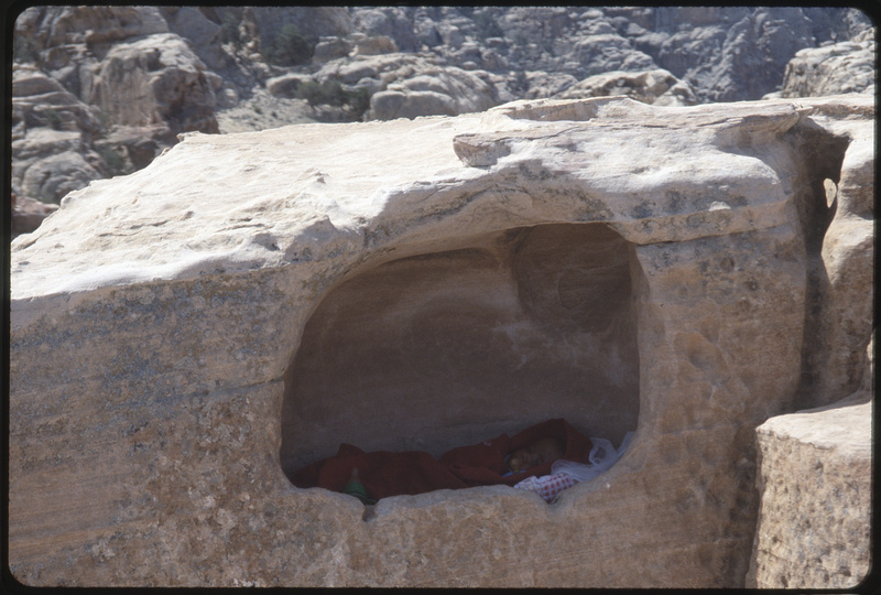 A child sleeping in a hollow rock in a high place for Sacrifice in Petra
