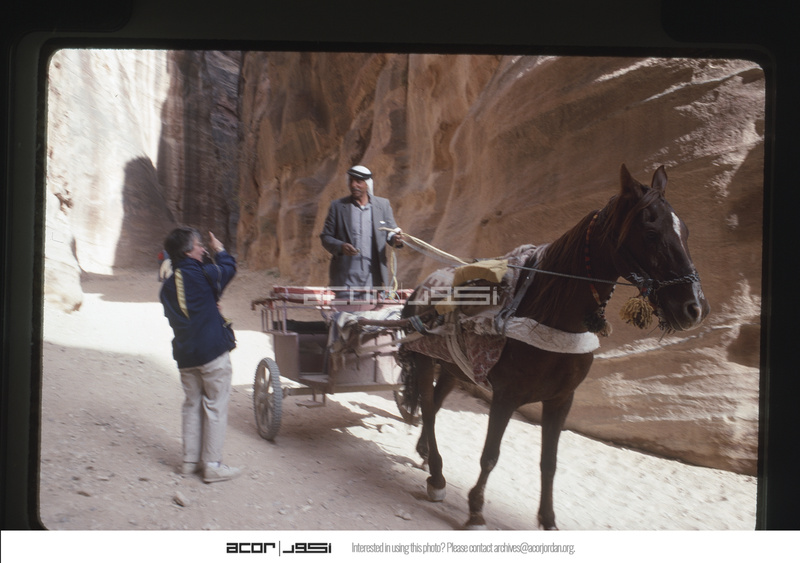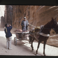 Bedouin man with horse-drawn carriage posing for Valerie Hane in the Siq