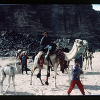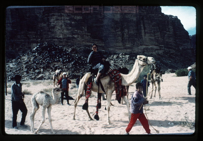 Barbara A. Porter on camel being led by a bedouin boy in Wadi Rum