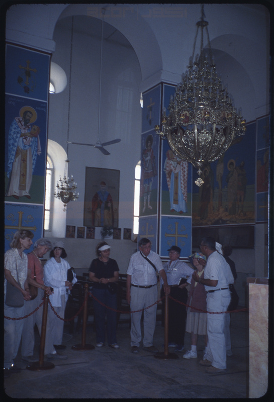 Tourists with a guide looking to the Madaba Mosaic Map in St. George's Church