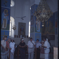 - Tourists with a guide looking to the Madaba Mosaic Map in St. George's Church