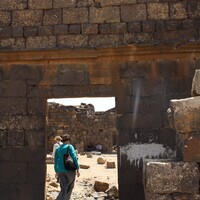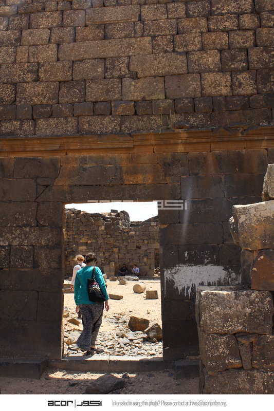 - Jordan. Umm al Jimal, the West Church, Maria Trogolo walking through doorway