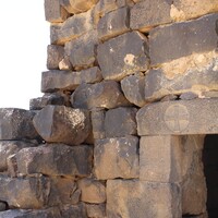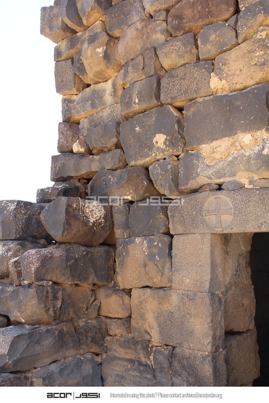 - Jordan. Umm al Jimal, the West Church, detail of wall, lintel over doorway with cross