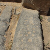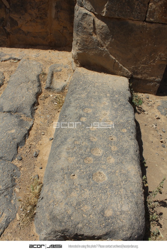 - Jordan. Umm al Jimal, doorstep at the main doorway of the Commodus Gate, hinge cup in upper middle, holes thought to have been used for games of Mangala