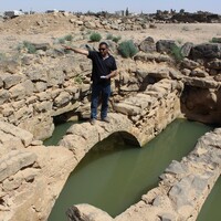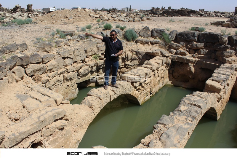 Jordan. Umm al Jimal, Nabataean reservoir, featuring arches used to support a roof that kept drinking water free of contamination and evaporation. Pictured: site steward Muaffaq al-Masaeed