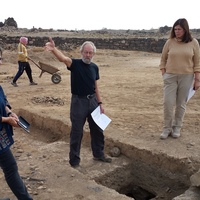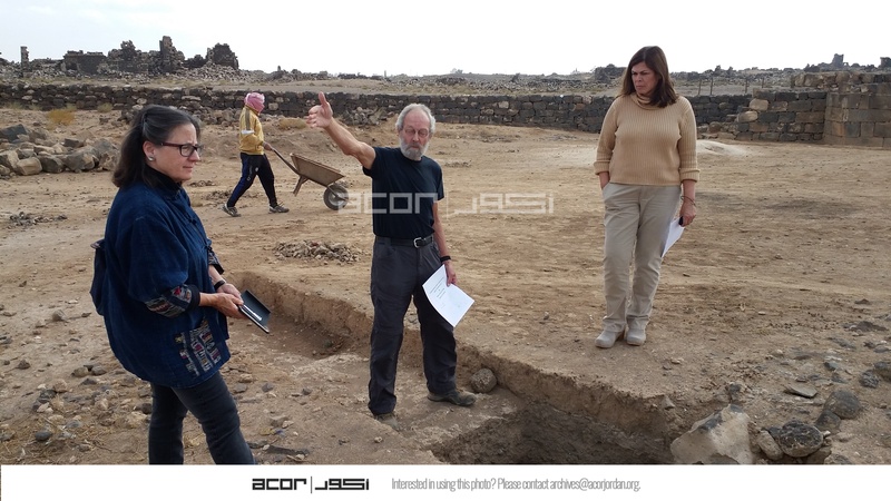 - Jordan. Umm al Jimal, excavation of the Commodus Gate, ACOR director Barbara Porter, Bert de Vries, Huda Kilani of USAID SCHEP, local worker in background