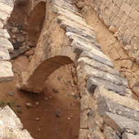 Jordan. Umm al Jimal, reservoir on outside of House XVIII. Delivered through a channel, water would run under the wall into the basement reservoir