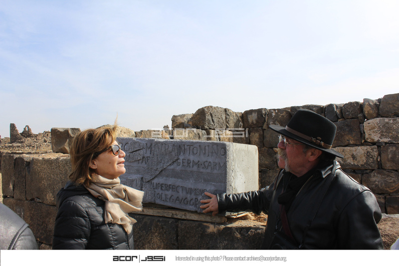 Jordan. Umm al Jimal, replica inscription for Commodus Gate in latin, visitors