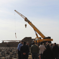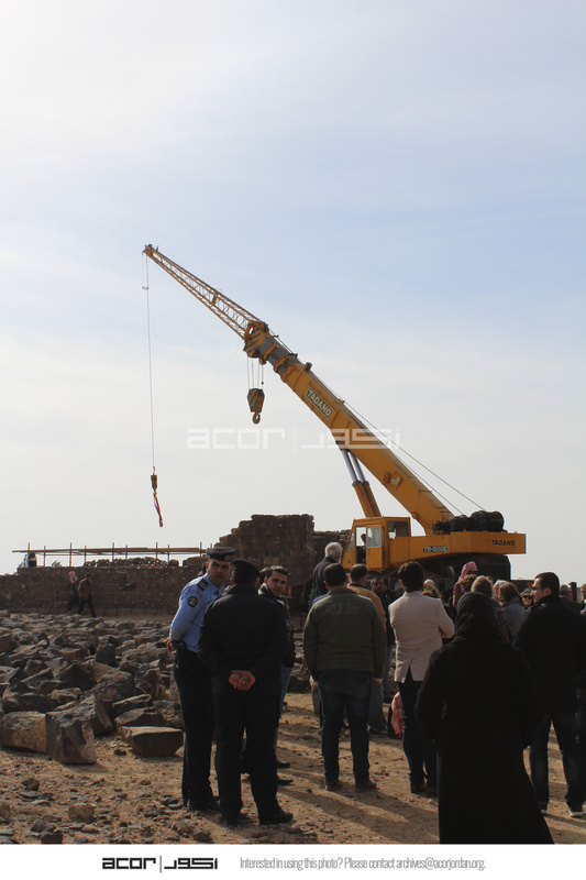Jordan. Umm al Jimal, crane for restoration activities, visitors