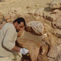 - Jordan. Petra, Temple of the Winged Lions, Khaled Wakhyan cleaning in southwest quadrant during consolidation work