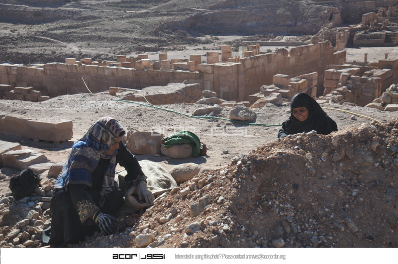 Jordan. Petra, Temple of the Winged Lions, landscape team members Ageleh Jmeidi and Khitmeh Aljdelat filling burlap sacks to support the cella path build-out