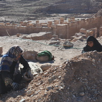- Jordan. Petra, Temple of the Winged Lions, landscape team members Ageleh Jmeidi and Khitmeh Aljdelat filling burlap sacks to support the cella path build-out