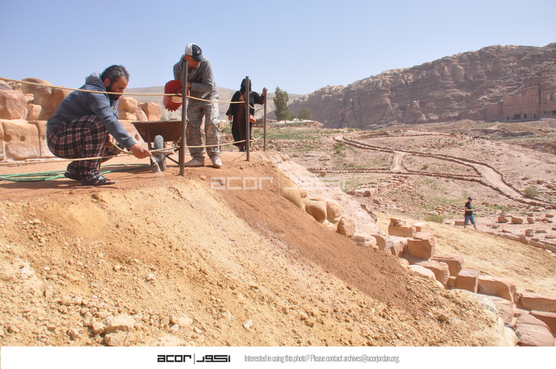Jordan. Petra, Temple of the Winged Lions, path build-out completed, with course sand added to bank in front of cella, fence posts installed, team members