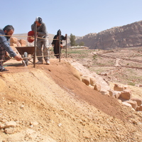 - Jordan. Petra, Temple of the Winged Lions, path build-out completed, with course sand added to bank in front of cella, fence posts installed, team members