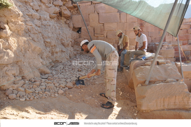 Jordan. Petra, Temple of the Winged Lions, cobble layer for southwest quadrant backfilling / buttress, team members using a hoe