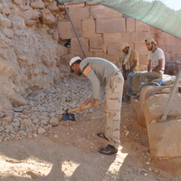 - Jordan. Petra, Temple of the Winged Lions, cobble layer for southwest quadrant backfilling / buttress, team members using a hoe