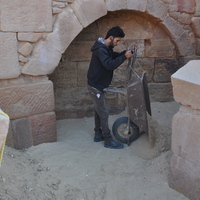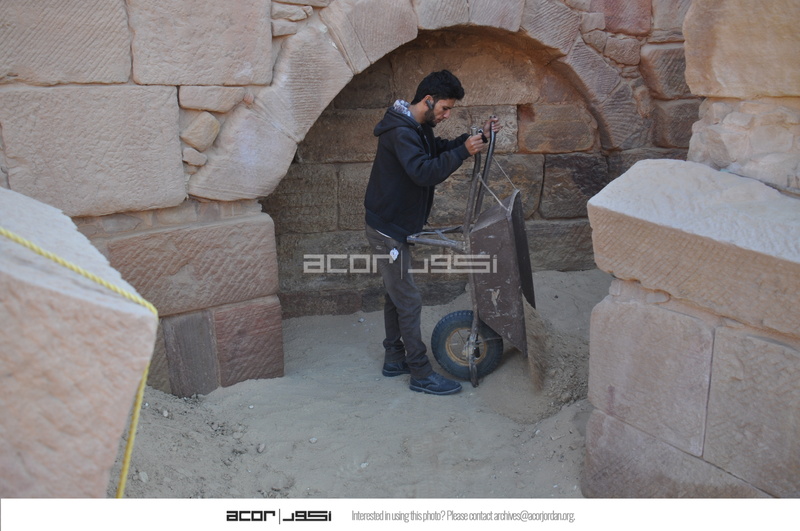 - Jordan. Petra, Temple of the Winged Lions, team member depositing sand/soil into southwest quadrant for backfilling purposes