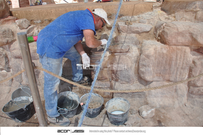 - Jordan. Petra, Temple of the Winged Lions, Baha‘ Jankhot applying mortar in front of cella podium