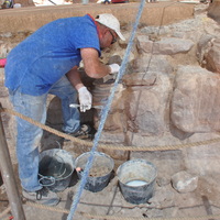 Jordan. Petra, Temple of the Winged Lions, Baha‘ Jankhot applying mortar in front of cella podium