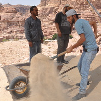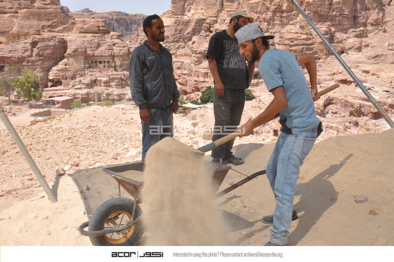Jordan. Petra, Temple of the Winged Lions, team member moves soil for backfilling