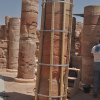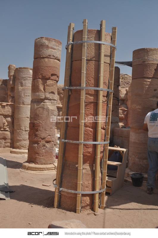 - Jordan. Petra, Temple of the Winged Lions, column 33E with wooden supports added by Franco Sciorilli’s team and column 34E behind