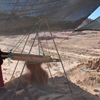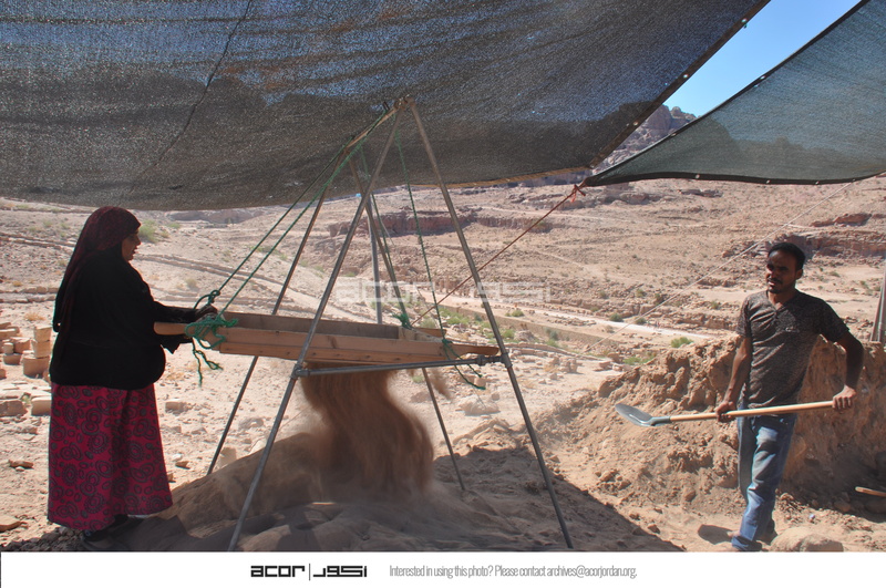 - Jordan. Petra, Temple of the Winged Lions, landscape team members Ageleh Jmeidi and Bassam Alfaqeer sifting dumped soil for backfilling in the southeast quadrant