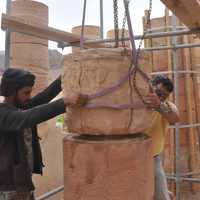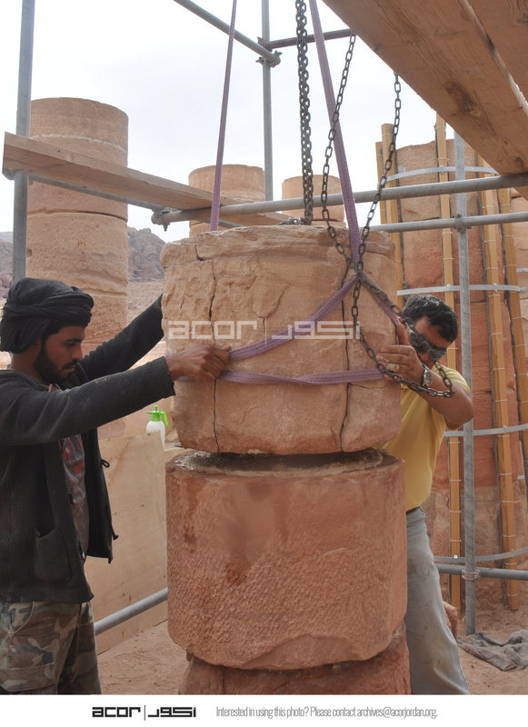 - Jordan. Petra, Temple of the Winged Lions, Hamza Wakhyan and Franco Sciorilli repositioning conserved column 34 E drum. Note pre-applied mortar layer between drums