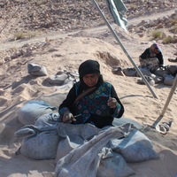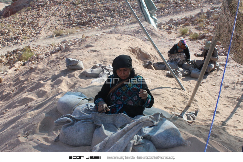 - Jordan. Petra, Temple of the Winged Lions, team member Ageleh Jmeidi making sandbags