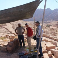 - Jordan. Petra, Temple of the Winged Lions, Ahmad Mowasa (in red) and other team members under shade with conservation materials