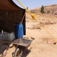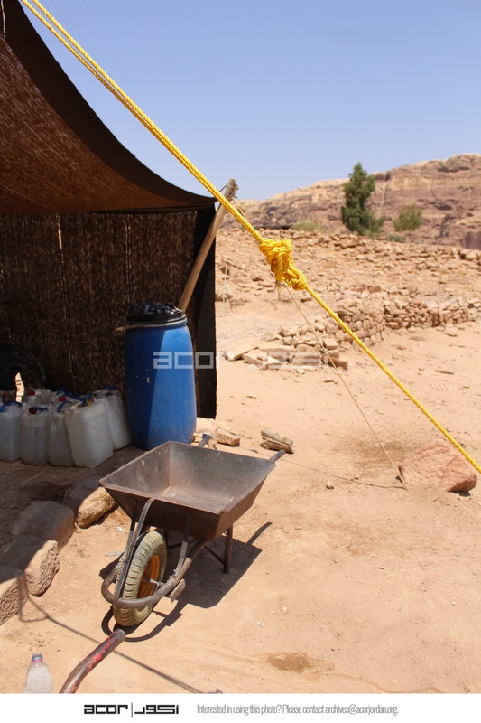 - Jordan. Petra, Temple of the Winged Lions, wheelbarrow, liquid container inside tent