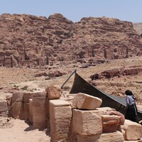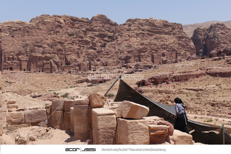 - Jordan. Petra, Temple of the Winged Lions, southeast quadrant, facing east, showing TWL team member and Royal Tombs in background