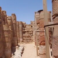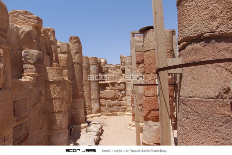- Jordan. Petra, Temple of the Winged Lions, looking at west aisle of cella with wooden column braces, facing north