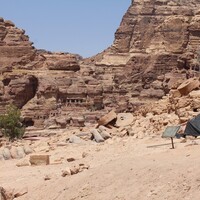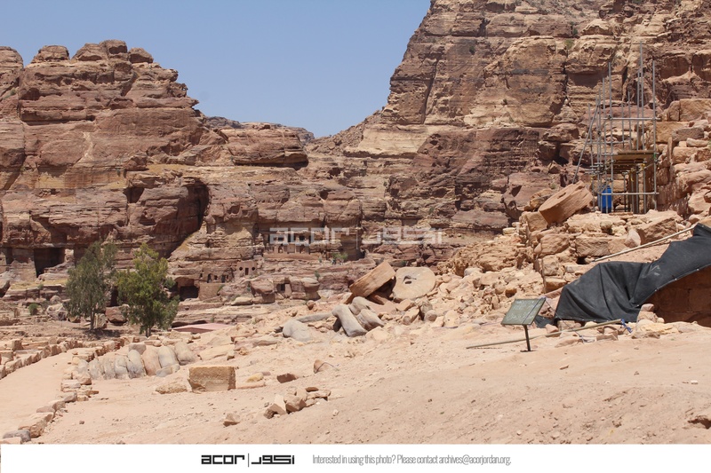 - Jordan. Petra, Temple of the Winged Lions, front of the temple facing west of the area south of the temple, scaffolding set up at pronaos, warning sign, fallen columns