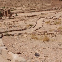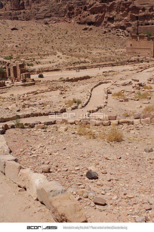 - Jordan. Petra, Temple of the Winged Lions, pathway on TWL site, Temenos Gate and Qasr al Bint in background