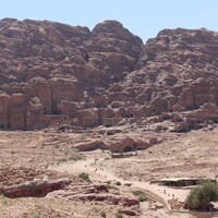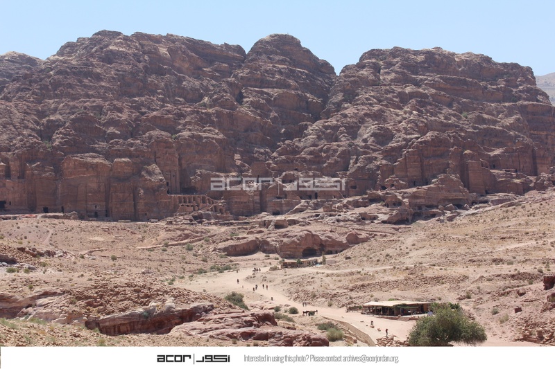 - Jordan. Petra, Temple of the Winged Lions, view from the temple to Royal Tombs, with pathway and Nymphaeum spring