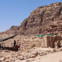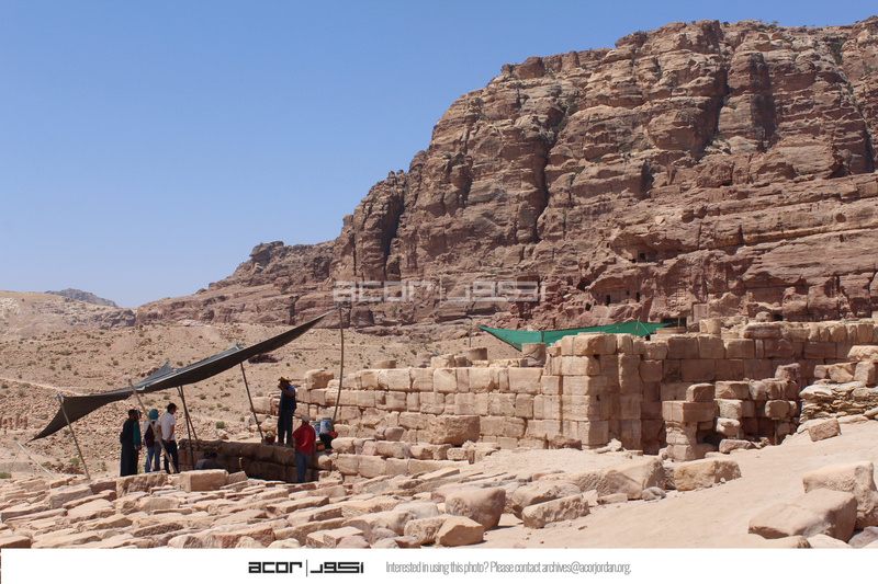 - Jordan. Petra, Temple of the Winged Lions, east wall of TWL, Umm al Biyara in background, team members under shade