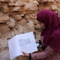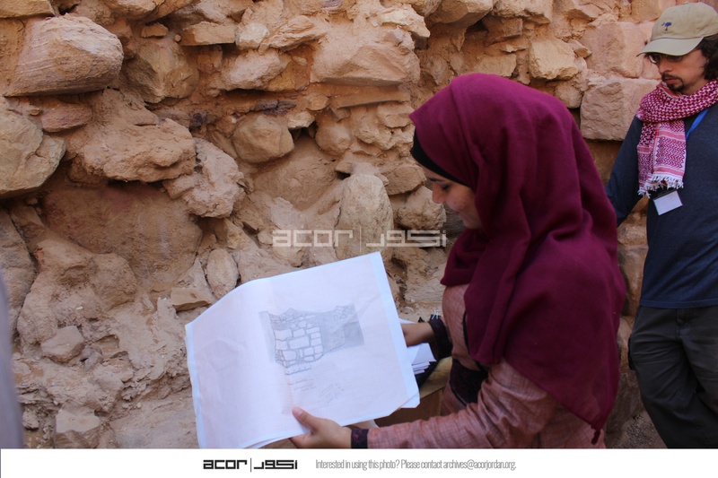 - Jordan. Petra, Temple of the Winged Lions, Halemah al Nawafleh conducts condition documentation of wall in southwest section