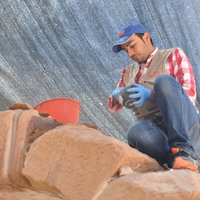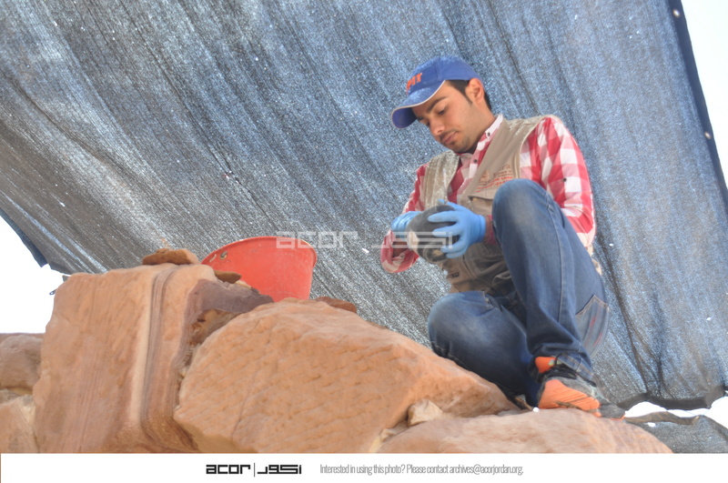 - Jordan. Petra, Temple of the Winged Lions, Obada Farajat mortaring, cleaning stones