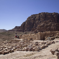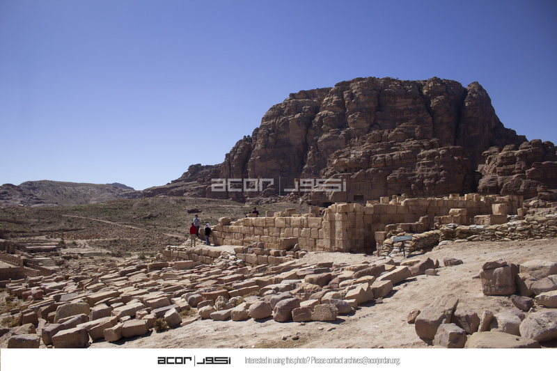 - Jordan. Petra, Temple of the Winged Lions, temple with lapidarium (architectural stone gallery), with Umm al Biyara in the background