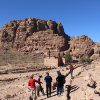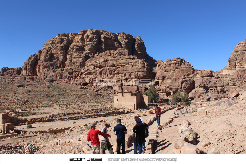 - Jordan. Petra, Temple of the Winged Lions, pathway, Qasr al Bint in far right background, visitors
