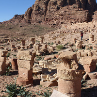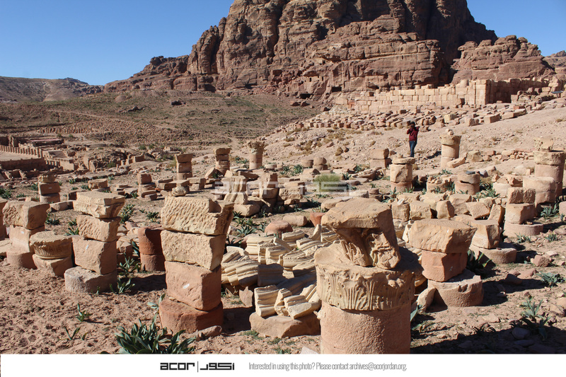 - Jordan. Petra, Temple of the Winged Lions, lapidarium, facing towards the southwest, Great Temple in background to left, Umm al Biyara in far background