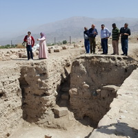 Jordan. Ghawr as Safi, showing the US Ambassador the Byzantine church at Khirbet Sheik Isa. The cross on the floor is the bottom of the cruciform baptistry in the floor