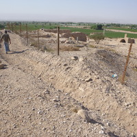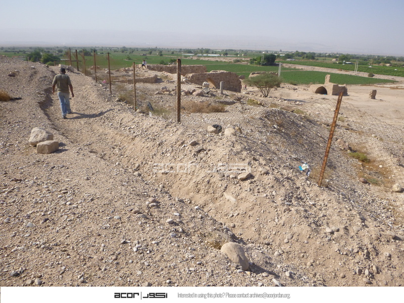 Jordan. Ghawr as Safi, fence, man walking next to fence, excavation to divert water erosion above the sugar factory (Masna’ as-Sukkar) archaeological site