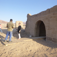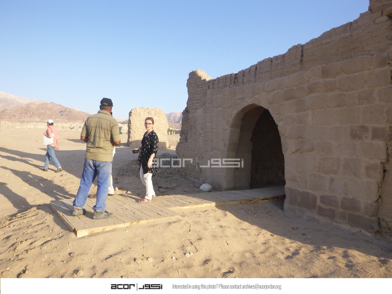 Jordan. Ghawr as Safi, visitors in front of entrance to sugar factory (Masna’ as-Sukkar) archaeological site