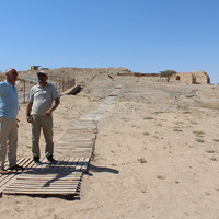 Jordan. Ghawr as Safi, Konstantinos Politis with Jehad Haron at sugar factory (Masna’ as-Sukkar) archaeological site