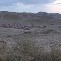 Jordan. Wadi Araba, Bir Madhkur, general view of tourist cabins from police station, Samra at Taybeh Mountain in the background