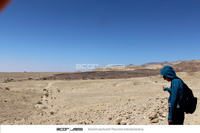 Jordan. Wadi Araba, Bir Madhkur, Maria Trogolo of USAID SCHEP walking on ad-Dlayi path, ancient incense route