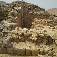 Jordan. Wadi Araba, Bir Madhkur, remains of rooms at Khirbat Bir Madhkur, wooden door and trusses added later to support the wall